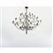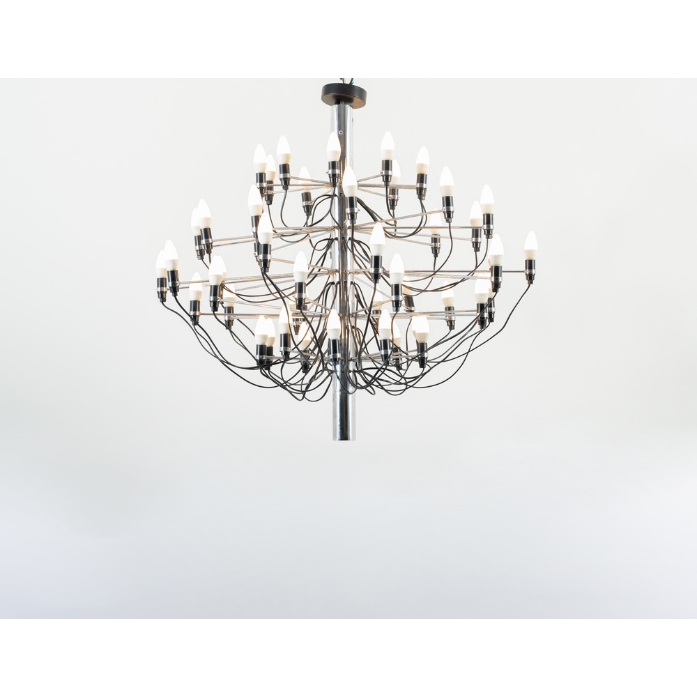 Lampada a sospensione a cinquanta luci modello “2097/50” disegno del 1958, struttura centrale in metallo cromato e bracci in ottone cromato nero. Attacco a soffitto e rosone di acciaio.
