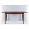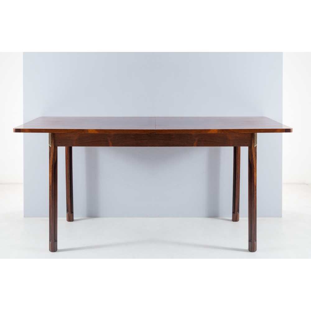 Tavolo da pranzo in legno esotico, piano rettangolare, quattro gambe cilindriche e sfaccettate. Minuterie in metallo. Lievi graffi e segni di uso.