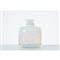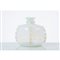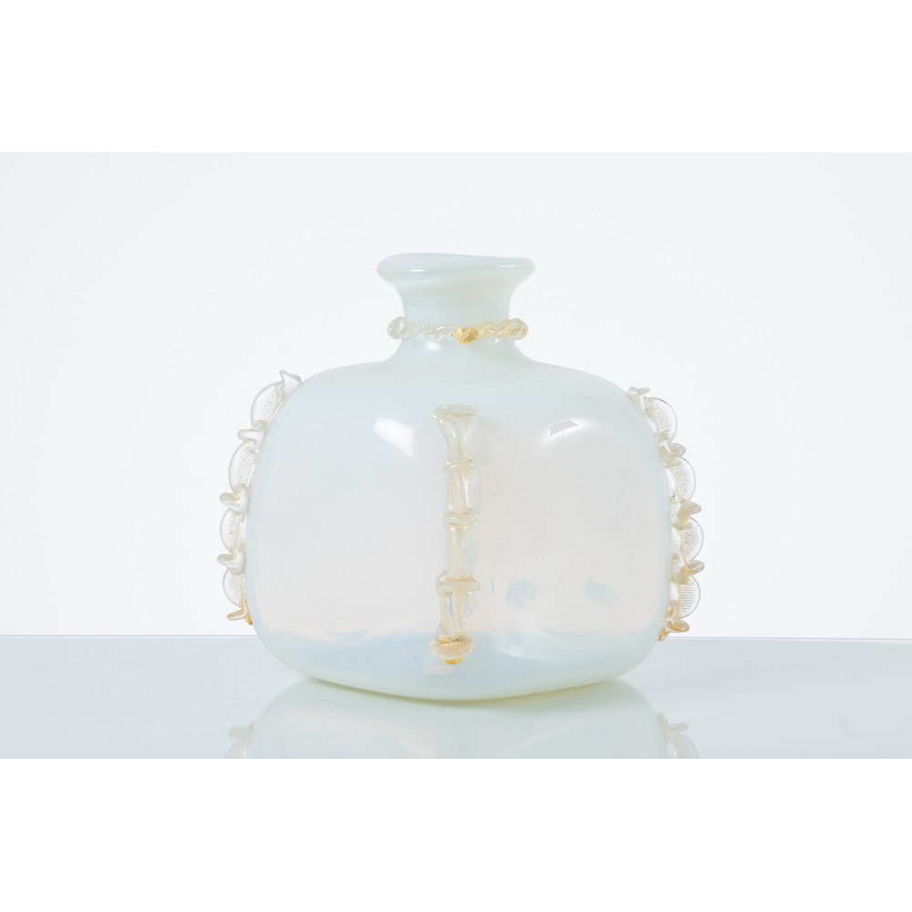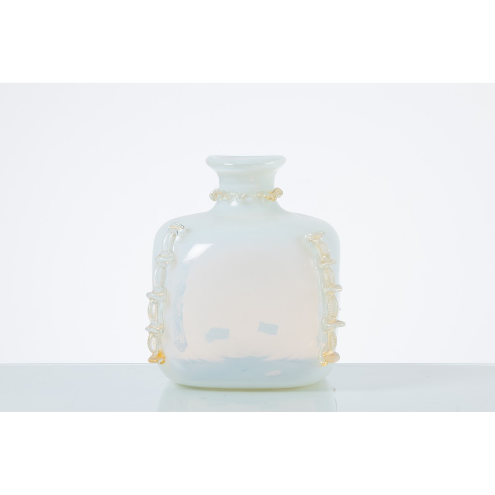 Vaso in vetro soffiato lattimo iridescente, corpo cubico con anse pizzicate laterali in vetro incolore e oro, collo basso e stretto decorato con torchon, bocca mossa circolare.