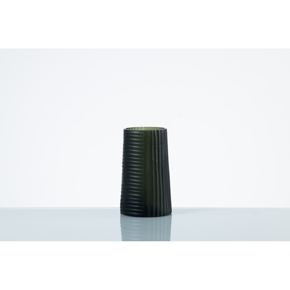 Vaso in vetro battuto verde e decorato con scanalature orizzontali e verticali, corpo cilindrico a decrescere con bocca circolare piana, base circolare. Etichetta di produzione.