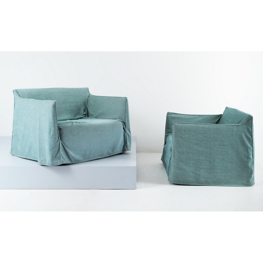 Coppia di poltrone modello “Ghost”, poltrona con struttura minimale e sottile imbottita in poliuretano espanso, rivestimento sfoderabile in tessuto a lisca di pesce turchese. Lievi segni d’uso.