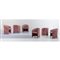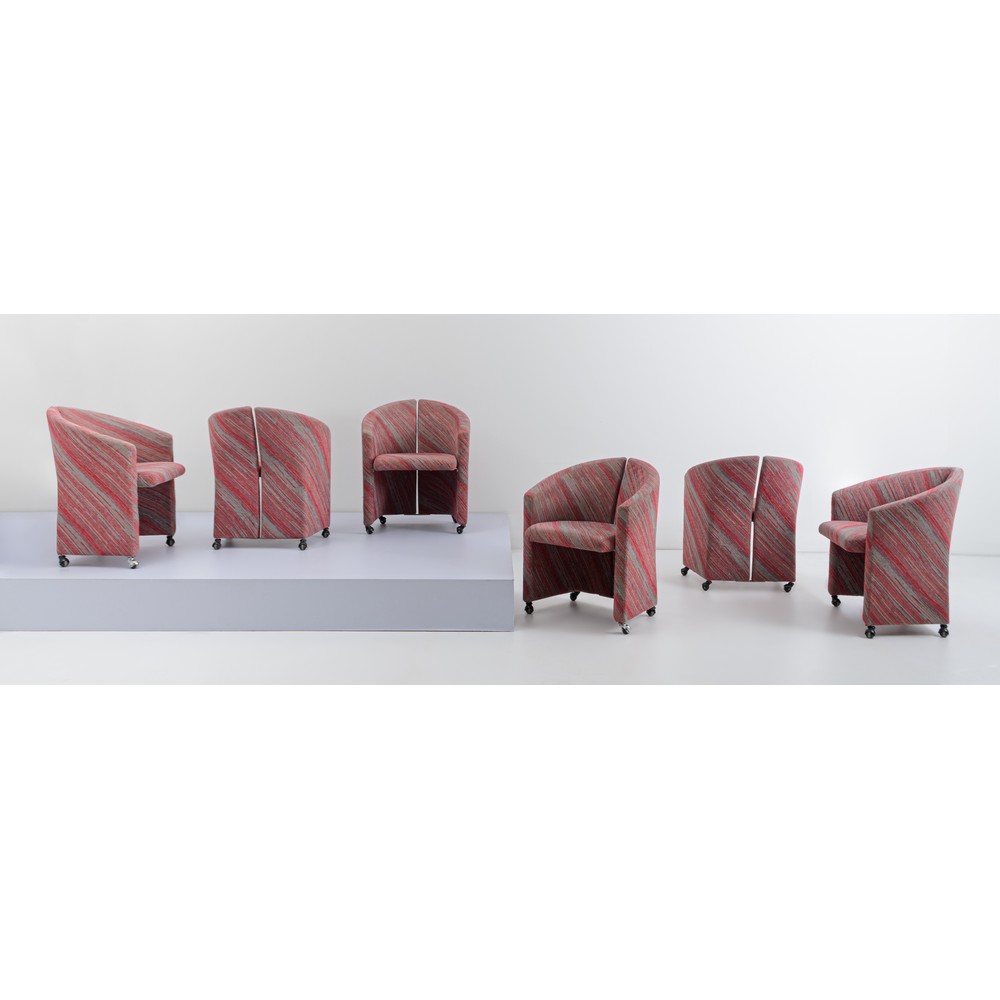 Sei poltrone su ruote con struttura in legno, imbottitura e rivestimento in tessuto originale con rigature rosse e verdi. Marchio di produzione. Segni del tempo.