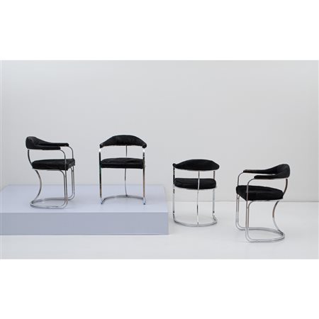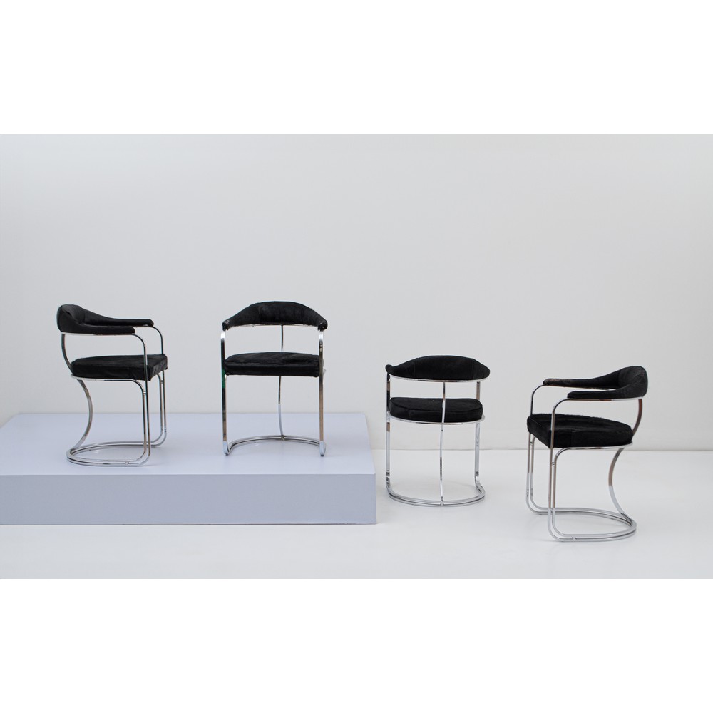 Quattro sedie con struttura in acciaio cromato, seduta e spalliera imbottite e rivestite con cavallino nero. Lievi usure al rivestimento.