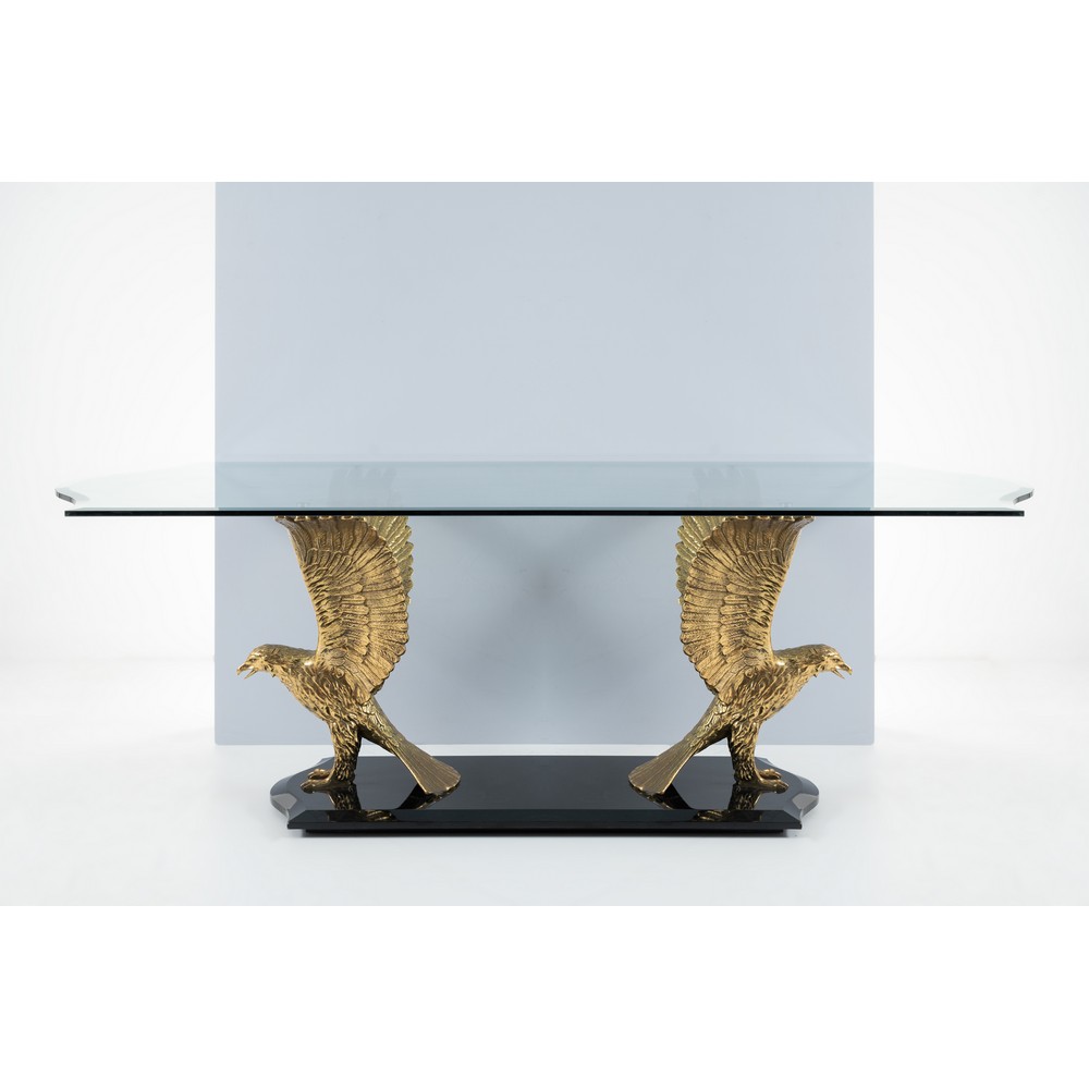 Tavolo “Hollywood Regency” con piedi composti da due sculture in ottone raffiguranti aquile, base in legno laccato nero, piano in cristallo sagomato. Lievi segni di uso alla base.