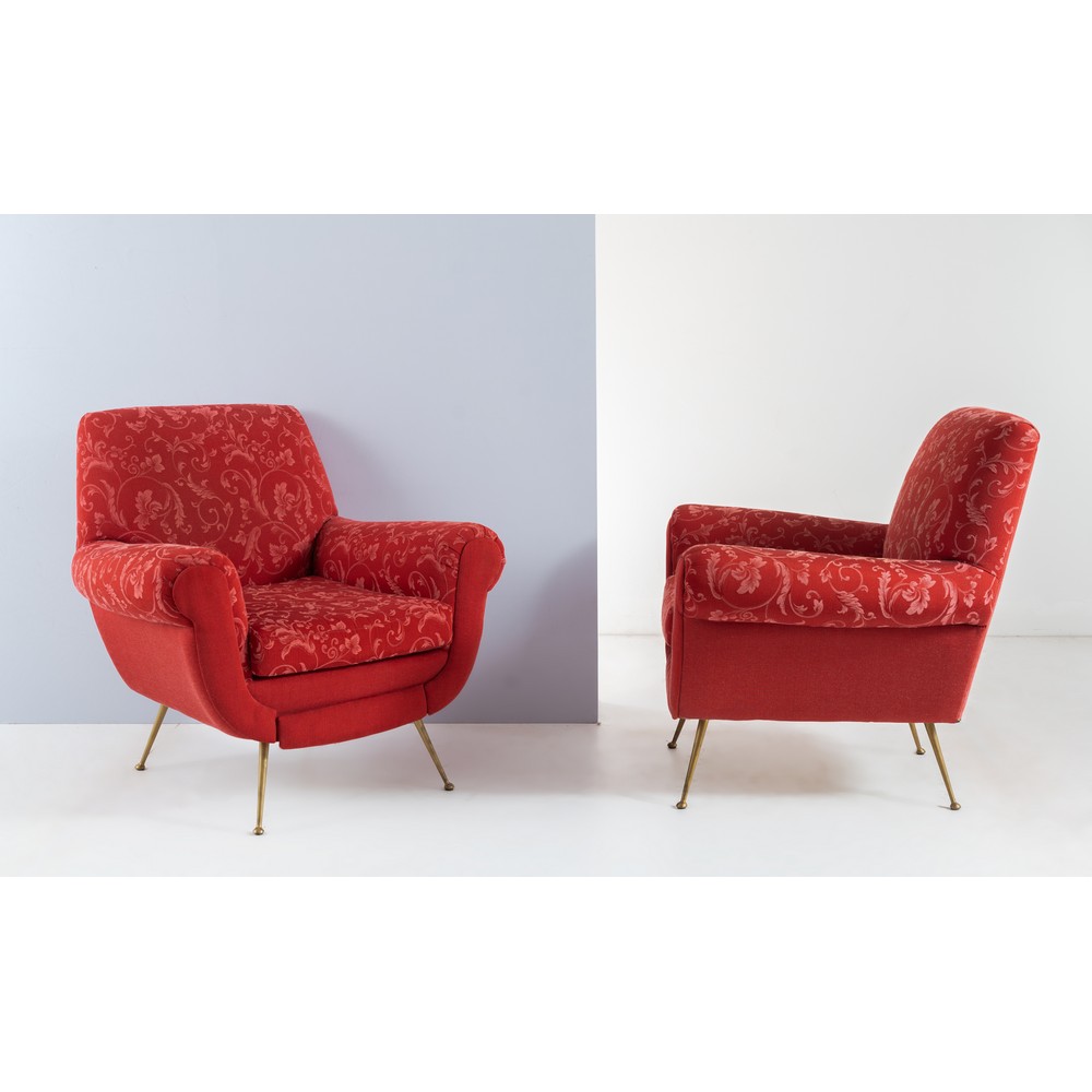 Coppia di poltrone con struttura in legno, seduta e spalliera con imbottitura e rivestite con tessuto nei toni del rosso a tinta unita e a fiori. Piedi a spillo in ottone.