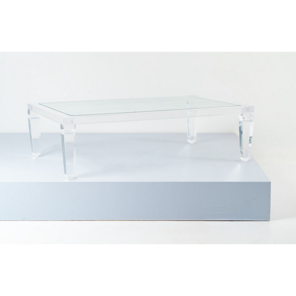 Tavolo basso con piano rettangolare in vetro, struttura in plexiglass trasparente, piede troncopiramidale. Lievi graffi.