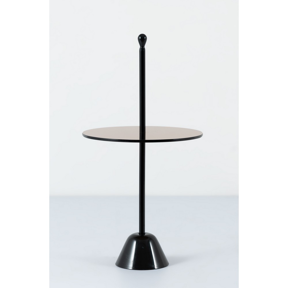 Tavolo polifunzionale della serie “Servi”, base in polipropilene, piano circolare in laminato plastico stratificato; impugnatura a pomolo all'estremità dell'asta in acciaio, base circolare. Marchio di produzione.