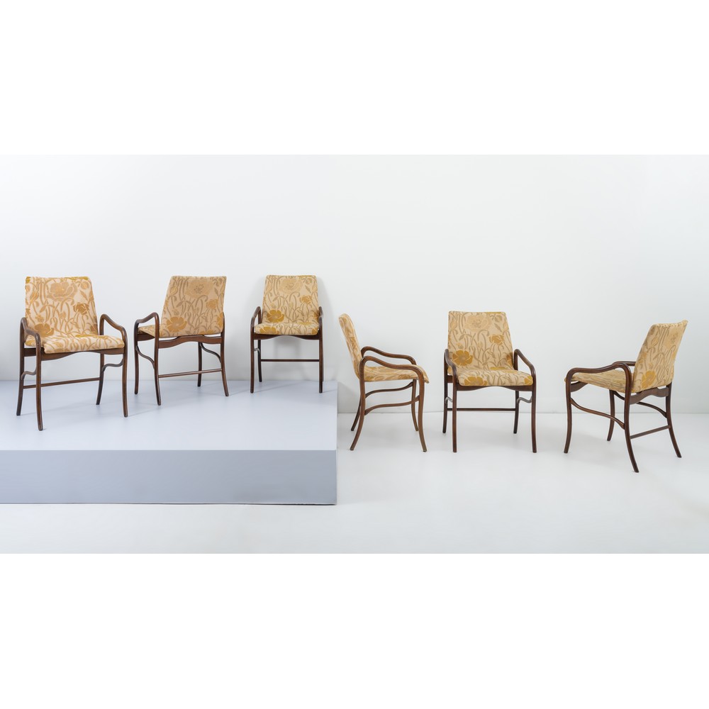 Sei sedie in legno curvato e sagomato braccioli bassi, spalliera e seduta con imbottitura e rivestite con tessuto a fiori. Segni d’uso.