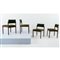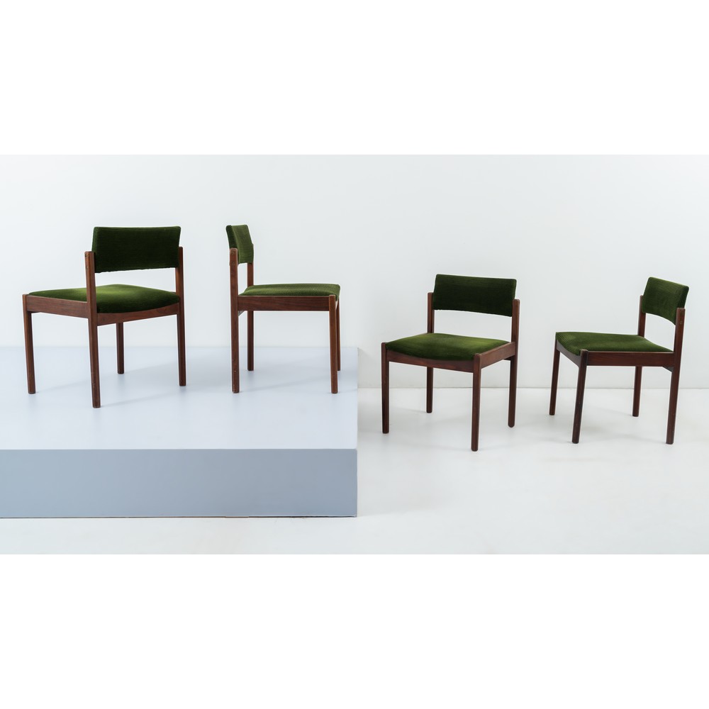 Quattro sedie con struttura in legno esotico, spalliera e seduta con imbottitura e rivestimento in velluto verde bosco. Segni di uso e graffi.