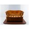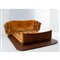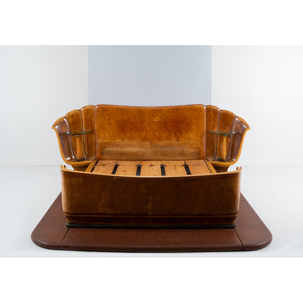 Grande letto in radica di betulla, spalliera mossa con curvature e due parti laterali a costole con comodini in cristallo ed ottone su elemento scanalato in betulla, pediera curva e base in legno ebanizzato e skai marrone. Segni d’uso.