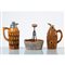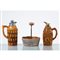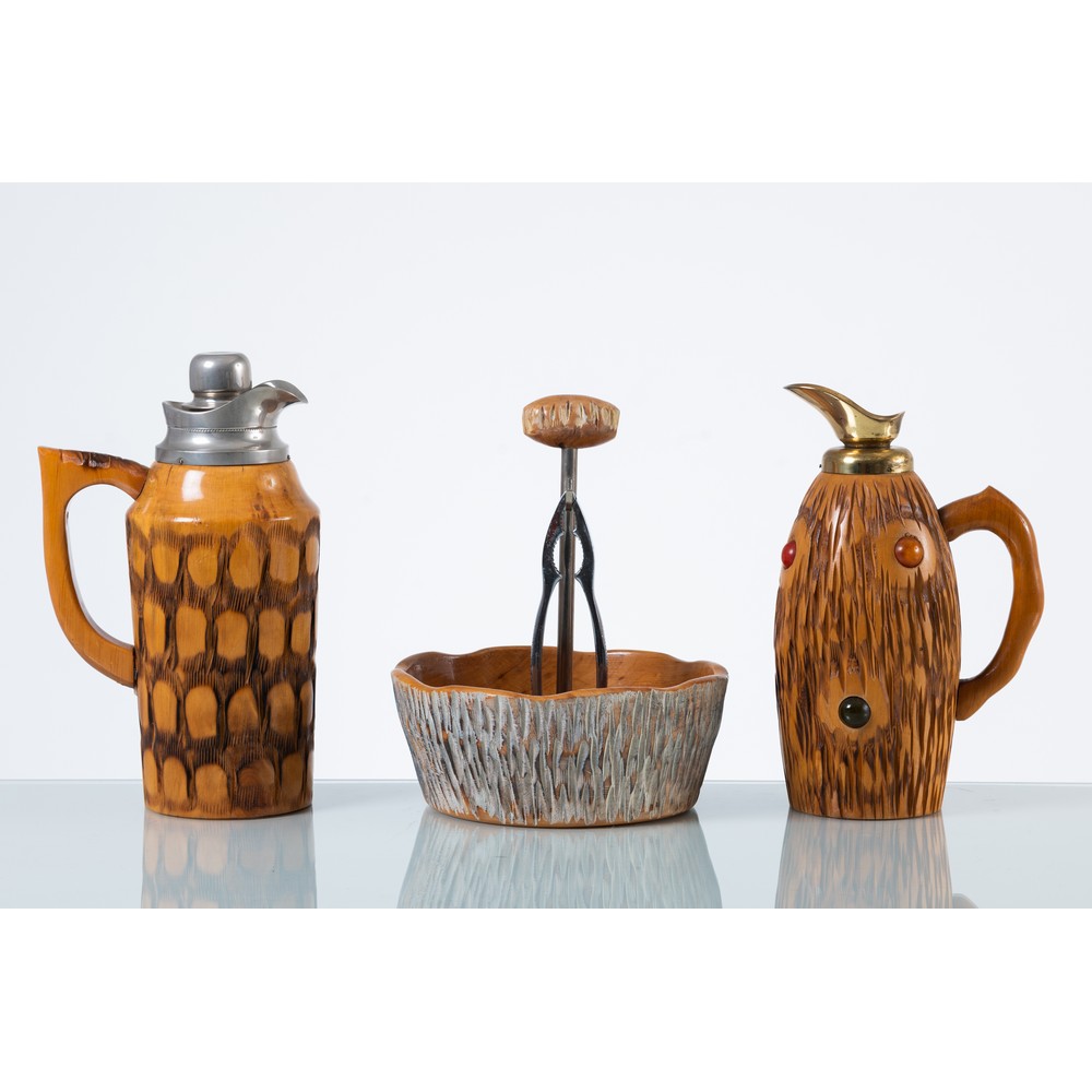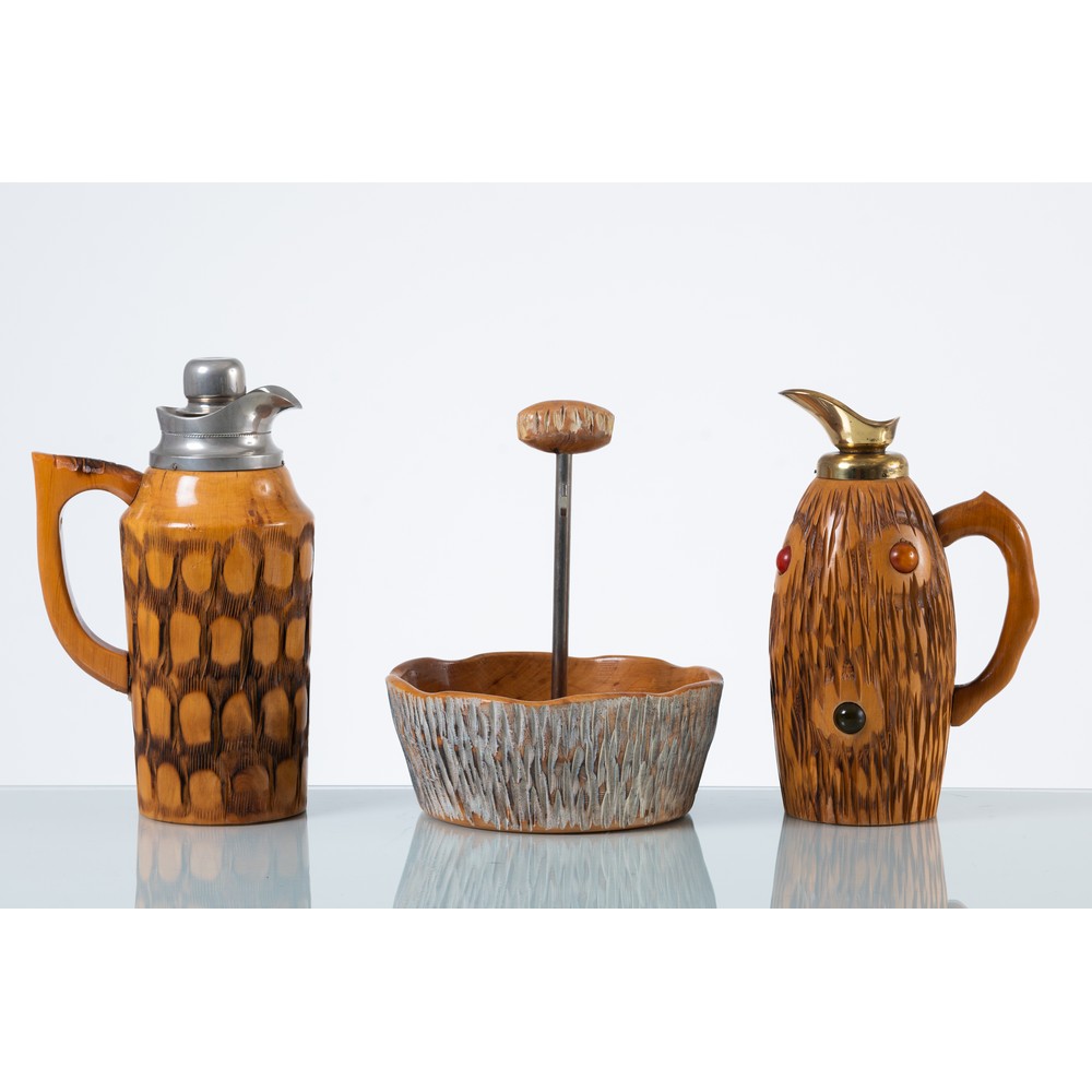 Due caraffe termiche in legno, una con versatoio e tappo in metallo argentato e una in metallo dorato con decori sferici di colore diverso. Un cestino in legno e metallo per frutta secca. Un tappo mancante. Marchio di produzione.