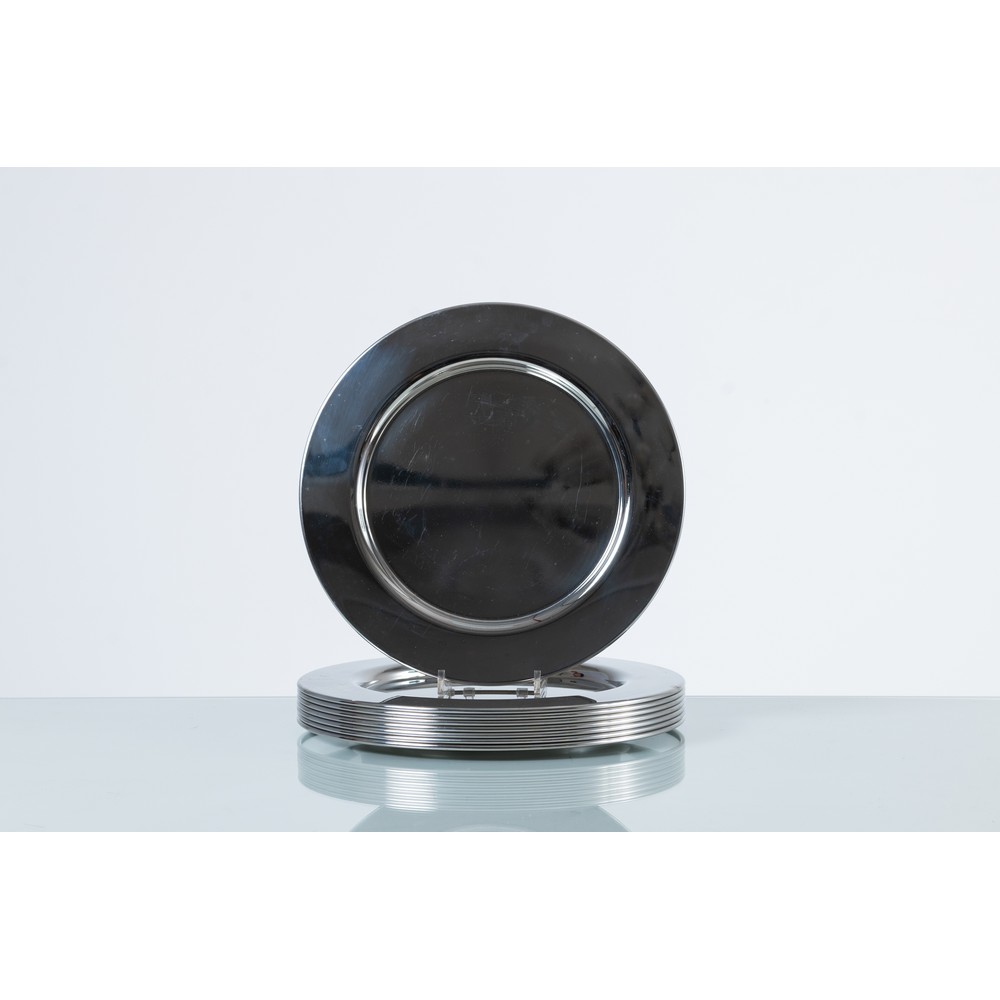 Otto sottopiatti circolari in acciaio 18/10 lucido, segni d’uso. Marchio di produzione