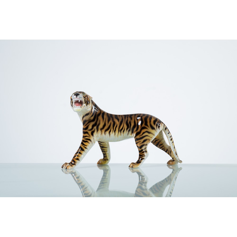 Figura di tigre in ceramica smaltata e decorata in policromia. Marchio di produzione.