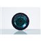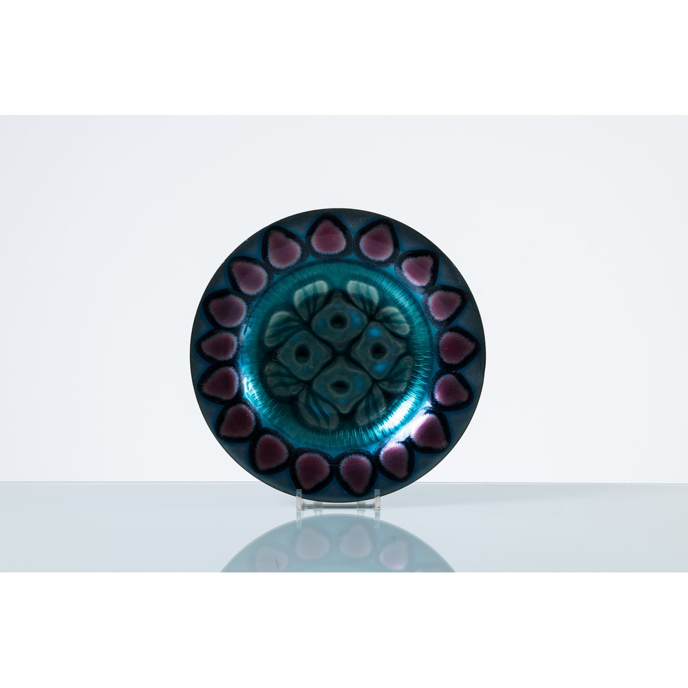 Piatto circolare in rame smaltato blu e decorato con motivi geometrici lilla, verde e nero. Firma.
