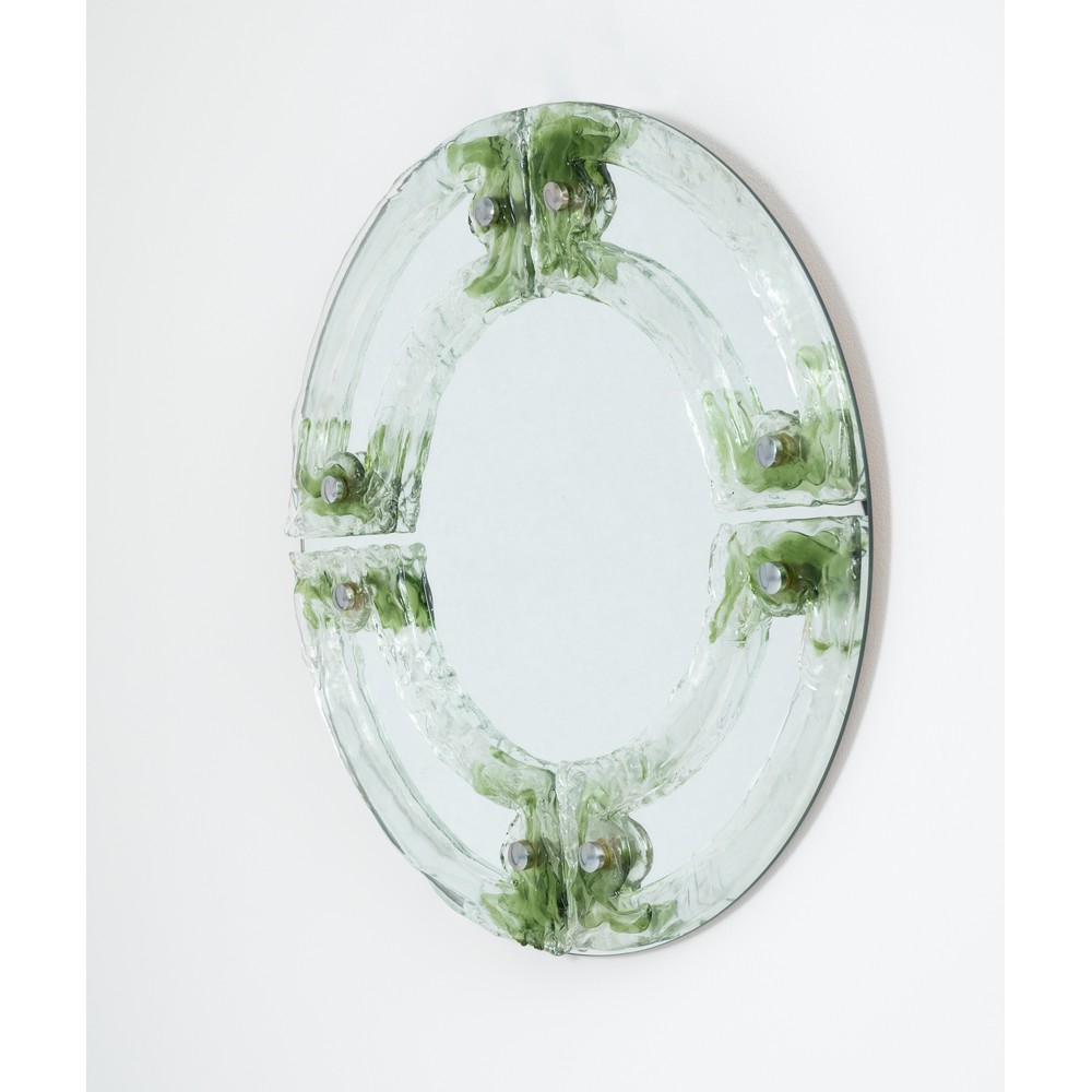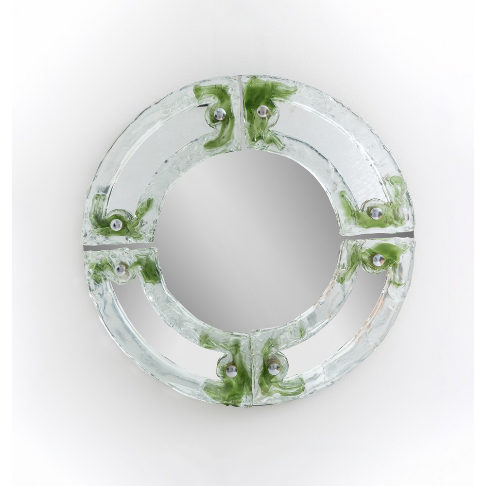 Specchio da parete circolare, composto da quattro elementi applicati in vetro di grosso spessore trasparente e verde, acciaio, cristallo specchiato.