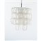 Lampada a sospensione a tre luci modello “Giogali”, struttura in metallo cromato con diffusore composto da maglie concatenate in vetro trasparente e lattimo.