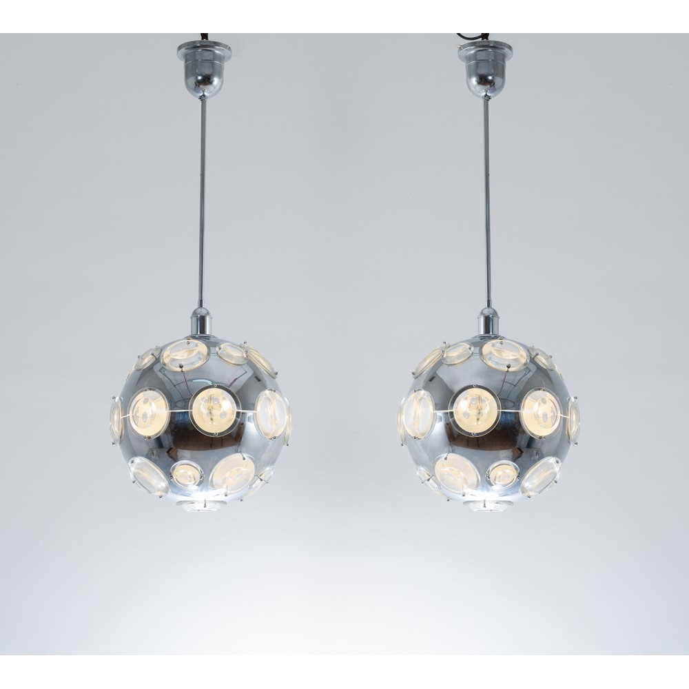 Coppia di lampade a sospensione ad una luce, struttura e diffusore sferico in metallo cromato con lenti di vetro.