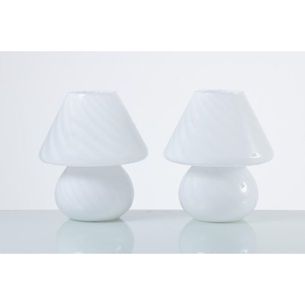 Coppia di lampade da tavolo ad una luce modello “Mushroom”, in vetro lattimo decorato con sfumature a spirale. Impianto elettrico originale.