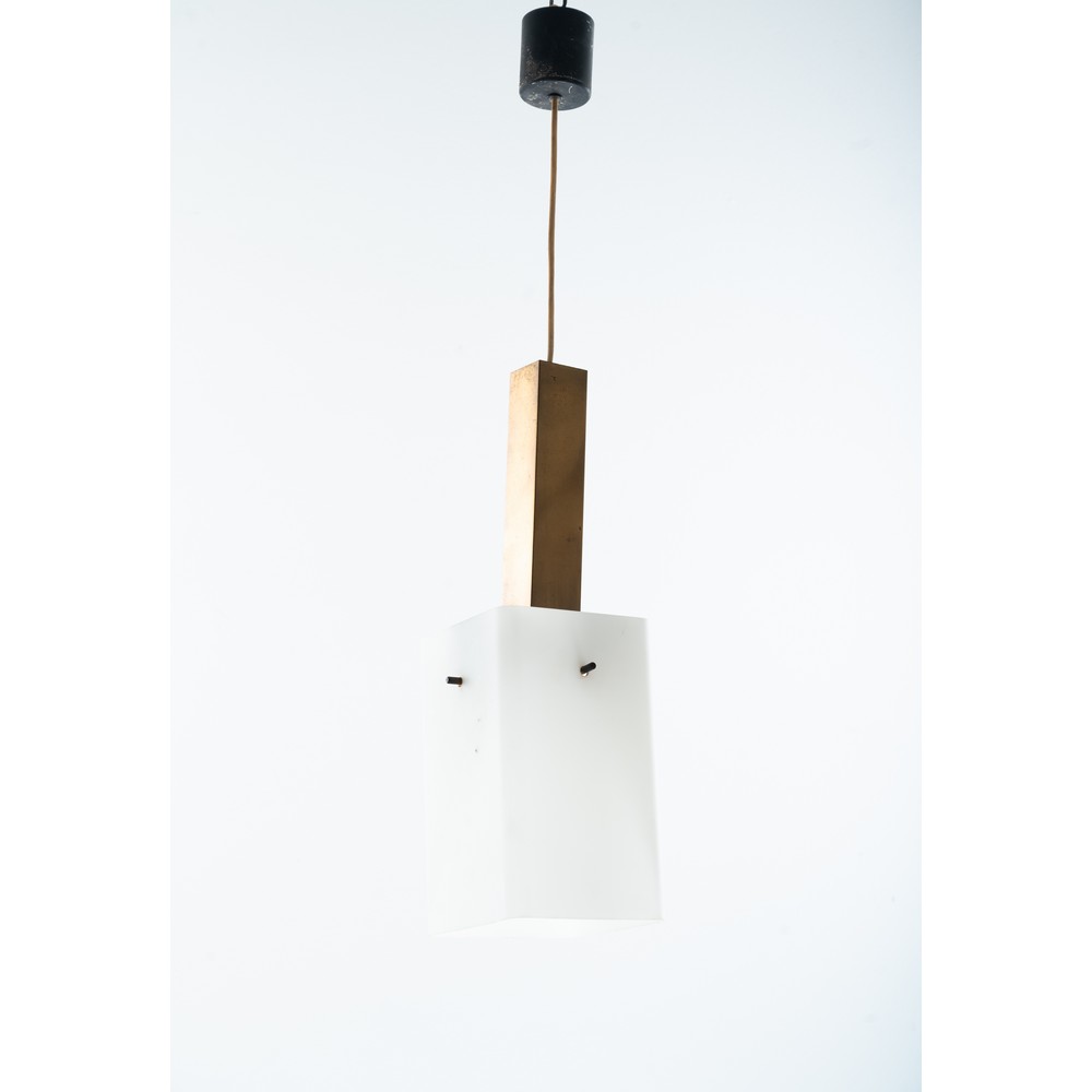 Lampada a sospensione ad una luce, struttura in ottone con diffusore parallelepipedo in vetro opalino satinato. Lievi ossidazioni.