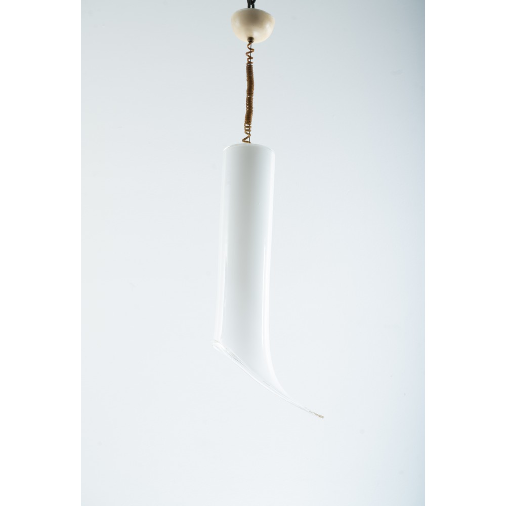 Lampada a sospensione ad una luce con diffusore a calla in vetro lattimo, cavo in acciaio e cavo elettrico originale a molla.