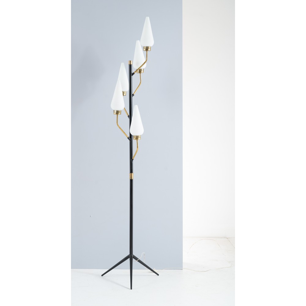 Lampada da terra a cinque luci, struttura in metallo verniciato nero, ottone, diffusori a goccia in vetro opalino lattimo, piede tripode.
