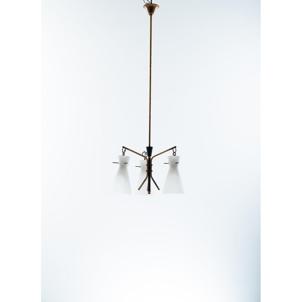 Lampada a sospensione a tre luci con struttura in metallo verniciato nero e dorato, diffusori conici in vetro lattimo. Ossidazioni.