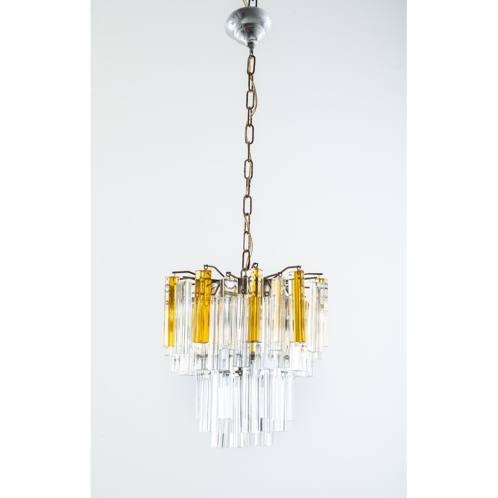 Lampada a sospensione a tre luci, struttura in metallo, diffusore composto da elementi “Trilobi” in cristallo trasparente e ambra, corpo a degradare.