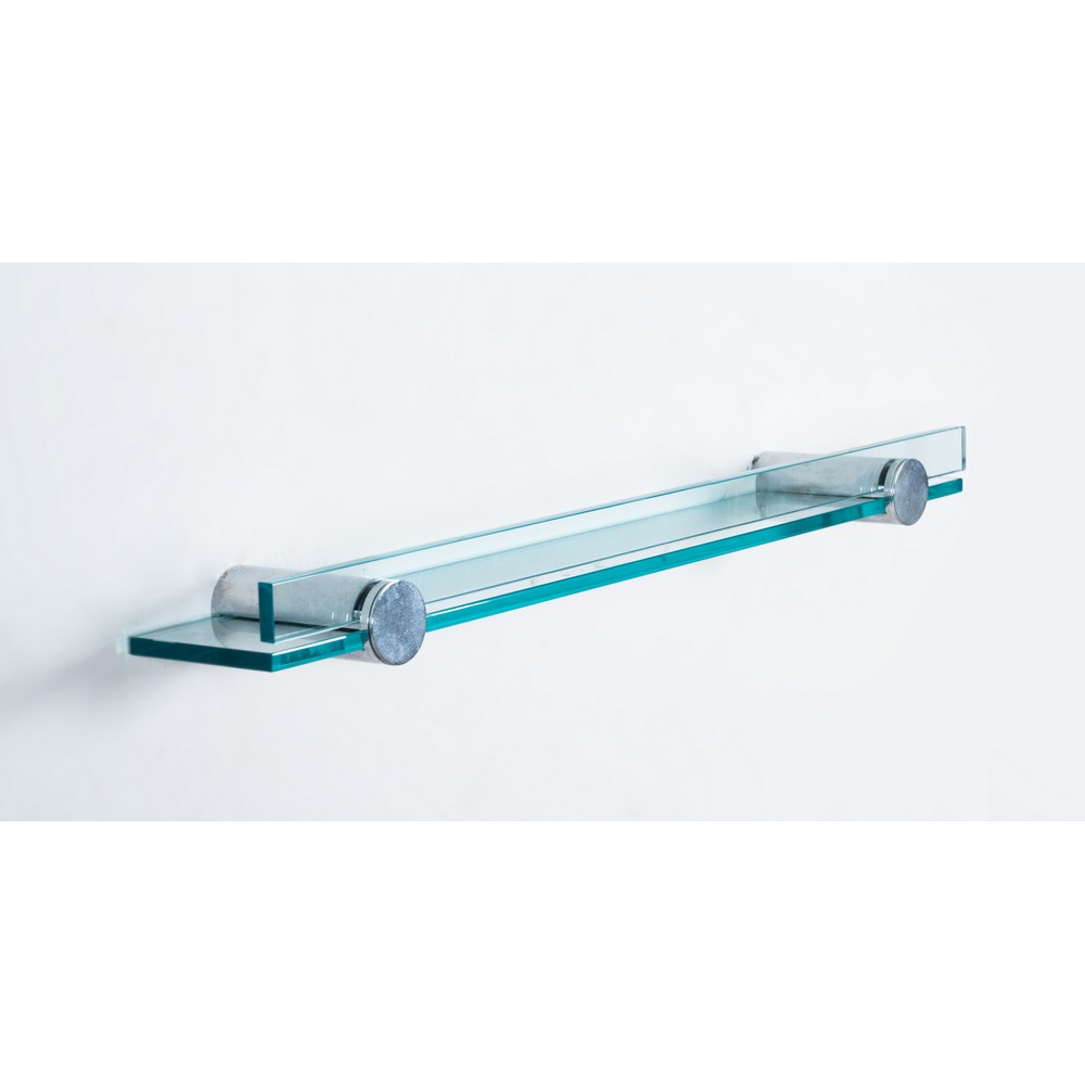Mensola in cristallo di grosso spessore, piano ed alzata rettangolari, struttura in metallo cromato. Graffi e segni di uso.
