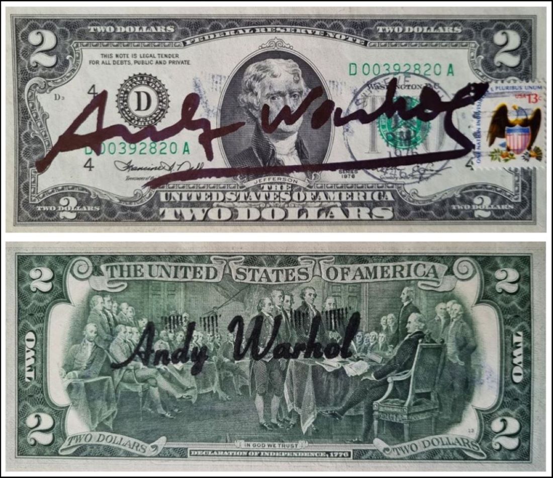 WARHOL ANDY Pittsburgh 1928 - New York 1987 "2 Dollars - D00392820A" Banconota da 2 dollari (Thomas Jefferson) recante sul fronte firma con pennarello nero e francobollo con timbro postale USA del 13 aprile 1976. Sul retro timbro della "Factory Warhol". Dimensioni mm 155,955x66,294 come riportate su certificato di autenticità ed unicità dell'esemplare, emesso da GALERIE 32 - Nizza. Opera contenuta in teca in plexiglass.
