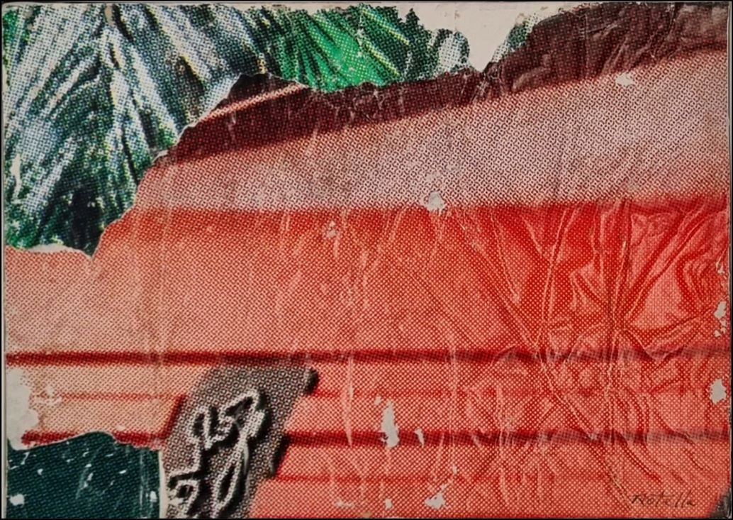 ROTELLA MIMMO Catanzaro 1918 - Milano 2006 "Le palme che non ci sono" Decollage e tecnica mista su tela cm 35x25, del 1998. Firmata sul fronte in basso a destra, sul retro titolo, firma e data. Opera pubblicata sul catalogo Mimmo Rotella "Segnali", Galleria Vinciana - Milano, 1999. Opera in fase di archiviazione.