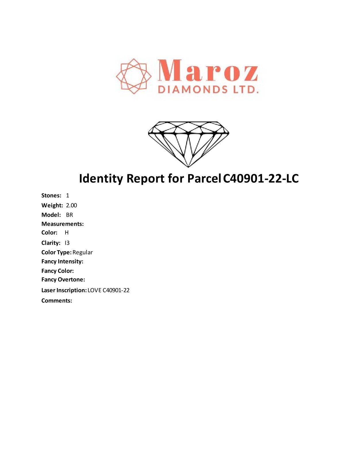 DIAMANTE NATURAL POLISHED 2 CARATI COLORE H - PUREZZA I3 - TAGLIO BRILLANTE - CERTIFICATO GEMMOLOGICO MAROZ DIAMONDS LTD MEMBRO ISRAEL DIAMOND EXCHANGE - NUMERO INCISO AL LASER NELLA CORONA - C40901-22-LC