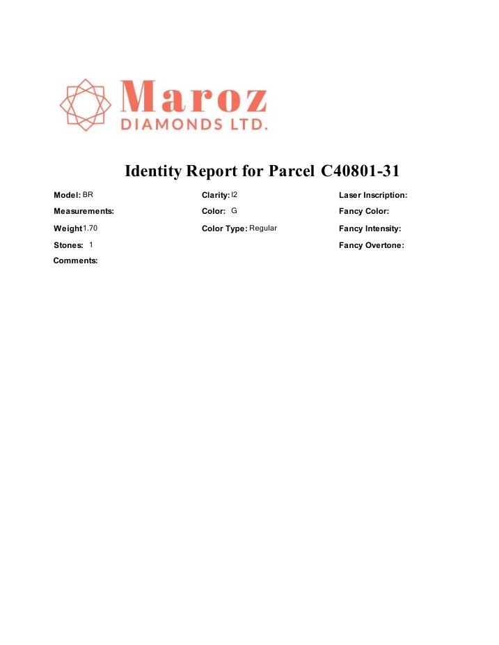 DIAMANTE NATURAL POLISHED 1,7 CARATI COLORE G - PUREZZA I2 - TAGLIO BRILLANTE - CERTIFICATO GEMMOLOGICO MAROZ DIAMONDS LTD MEMBRO ISRAEL DIAMOND EXCHANGE - C40801-31