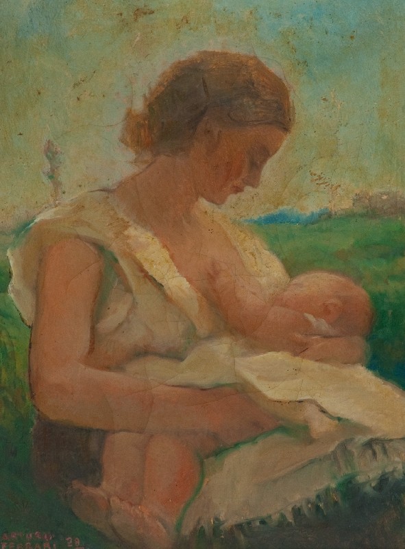 Arturo Ferrari (Milano 1861 - 1932) MATERNITÀ, 1928 Olio su tela, cm. 40x30 La tela presenta imperfezioni dovute al tempo. Firma e data in basso a sinistra.