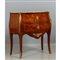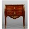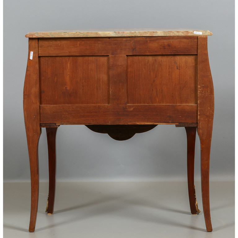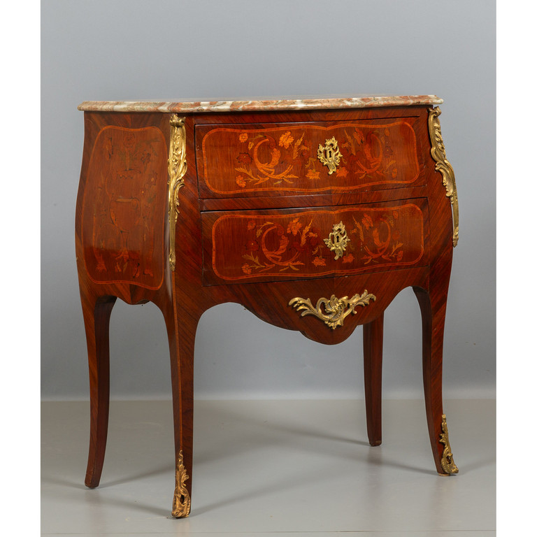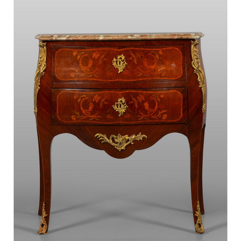 Piccolo comò in stile Luigi XV a due cassetti lastronato in palissandro ed intarsiato a motivi floreali movimentato su fronte e sui fianchi ricca deocrazione in bronzo dorato piano in marmo Francia sec.XIX