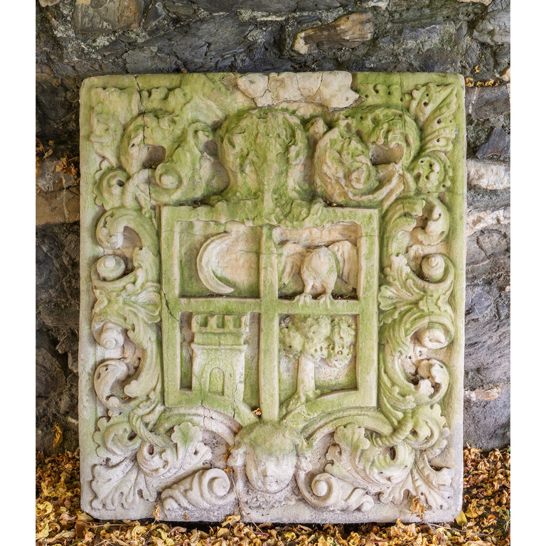 Grande stemma decorato con racemi cherubini e al centro stemmi nobiliari pietra d'Istria Veneto sec.XV