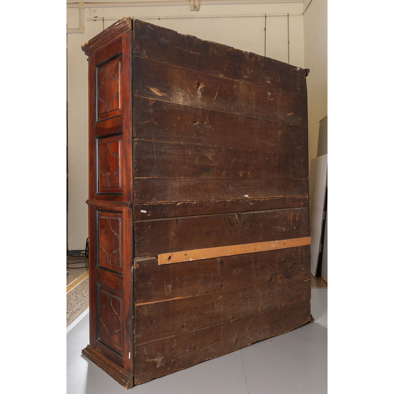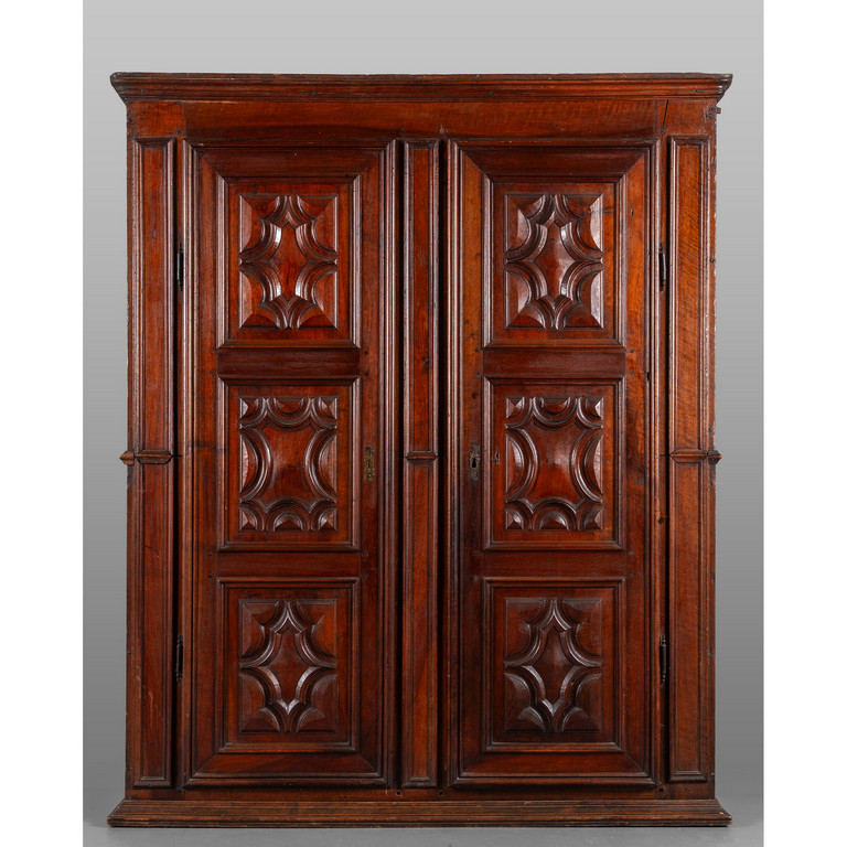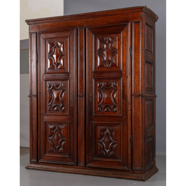 Armadio Luigi XIV in noce a due ante intagliato a motivi geometrici a rilievo Piemonte I metà sec.XVIII
