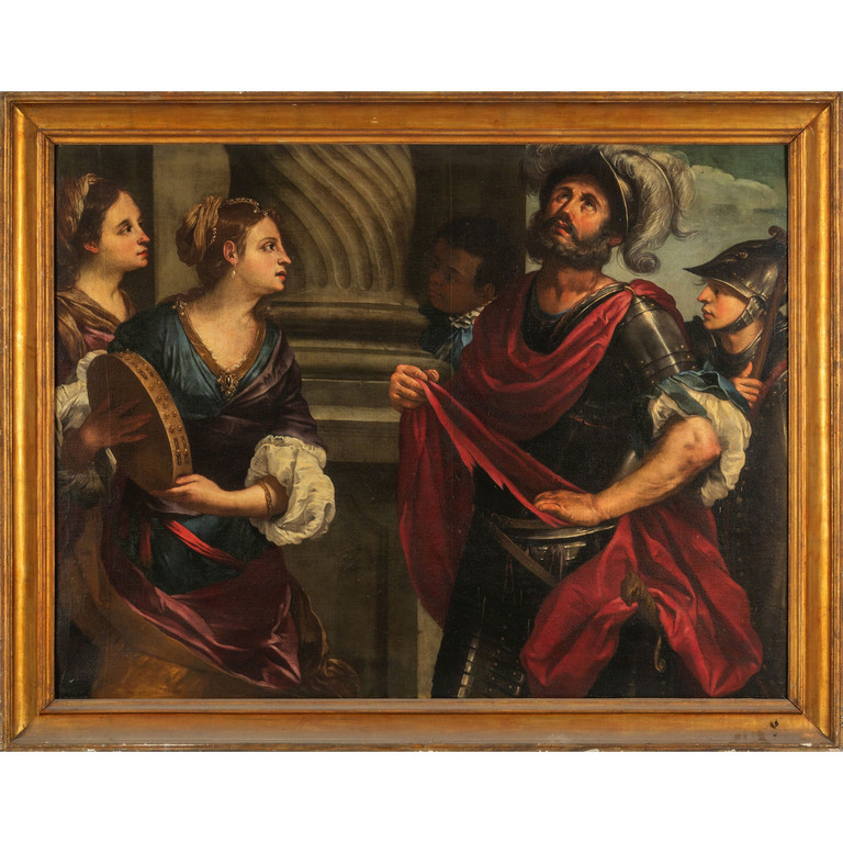 Scuola lombarda sec.XVII 'Davide incontra le donne che cantano le sue lodi' olio cornice coeva