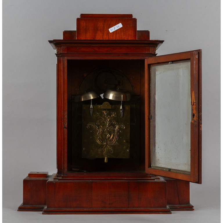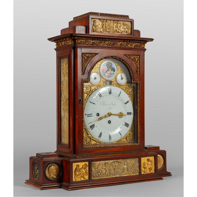 Pendola da tavolo in legno con riporti in pastiglia dorata quadrante f.to Johan Sachs Wien con calendario ripetizioni e fasi lunari inizi sec.XIX