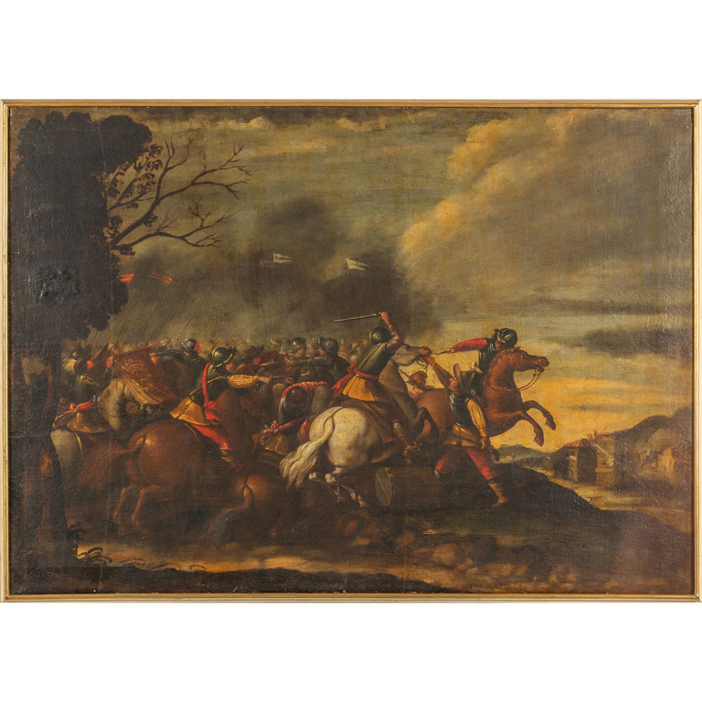 Precedente Lotto 0091 Successivo Aste Boetto - Via Mura dello Zerbino 10R, 16122 Genova ASTA DI ANTIQUARIATO E DIPINTI SEC.XIX Asta di Antiquariato e dipinti sec.XIX martedì 1 ottobre 2024 ore 15:00 (UTC +01:00) DIPINTO Scuola veneta sec.XVIII 'Battaglia' oliocm. 156x110