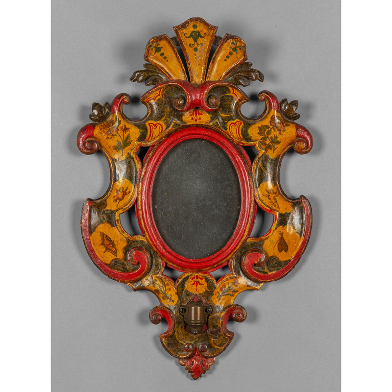 Specchiera Luigi XIV in legno intagliato dorato e policromato Venezia sec. XVIII