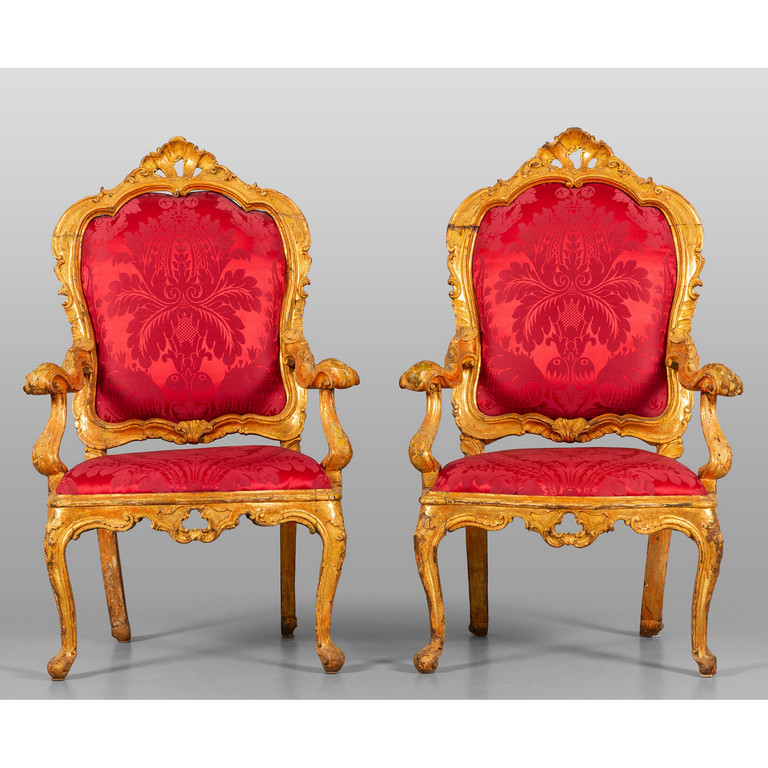 Coppia di poltrone Luigi XV in legno intagliato e dorato foderate in damasco rosso Venezia I metà sec.XVIII