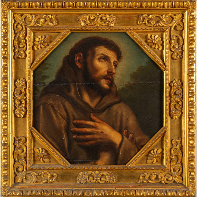 Scuola toscana sec. XVII 'San Francesco' olio su tavola cornice in legno intagliato e dorato