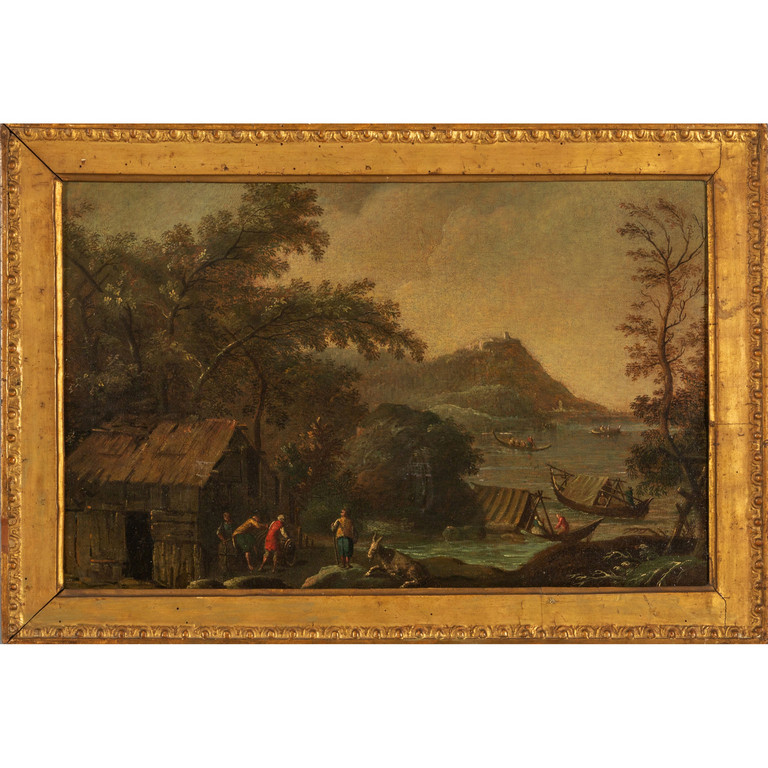 Scuola fiamminga sec.XVII 'Approdo sul lago con barche e figure' olio