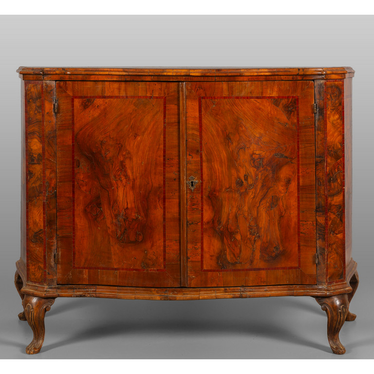 Credenza a due sportelli lastronata in noce e radica di noce Veneto sec.XVIII