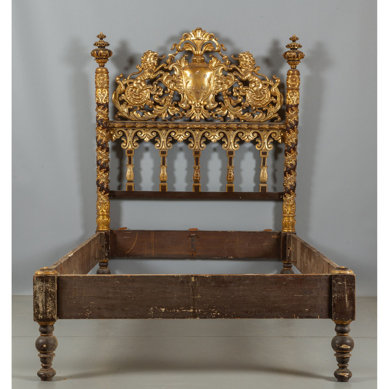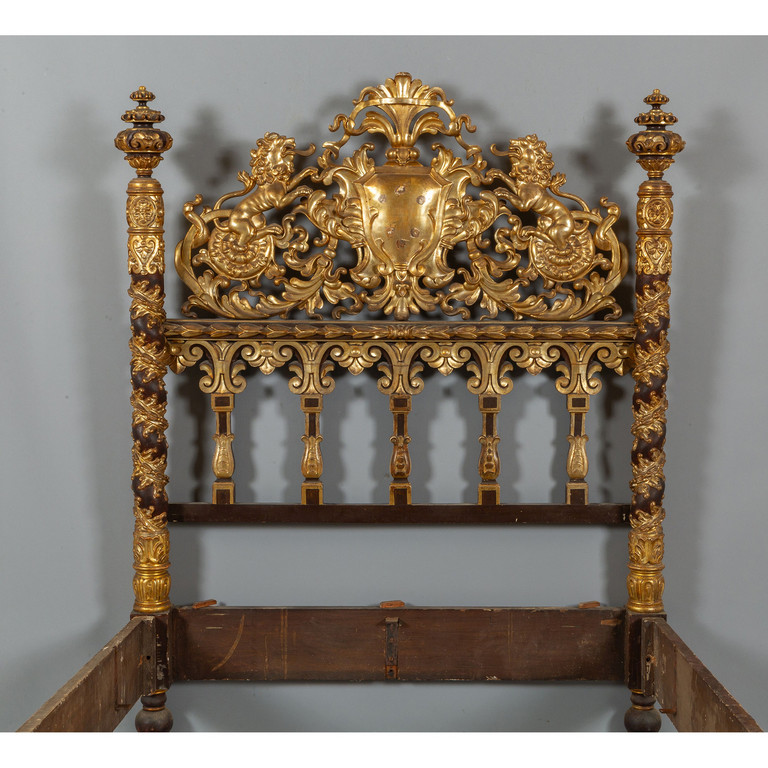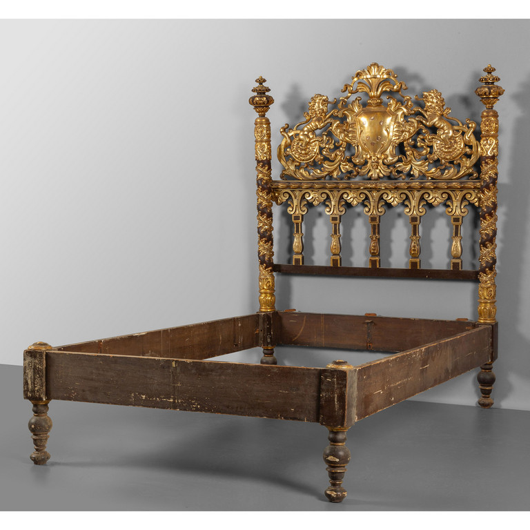 Letto in legno finemente intagliato e dorato testata con stemma araldico sec.XIX