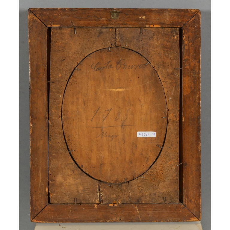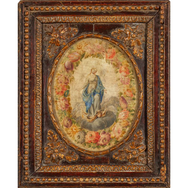 Scuola veneta II metà sec.XVIII 'Immacolata' tempera su pergamena cornice in legno intagliato laccato e dorato