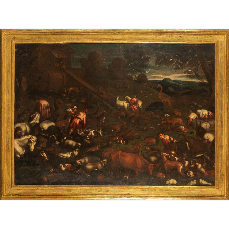 Scuola veneta sec.XVII 'L'imbarco degli animali sull'arca' olio cornice coeva in legno dorato