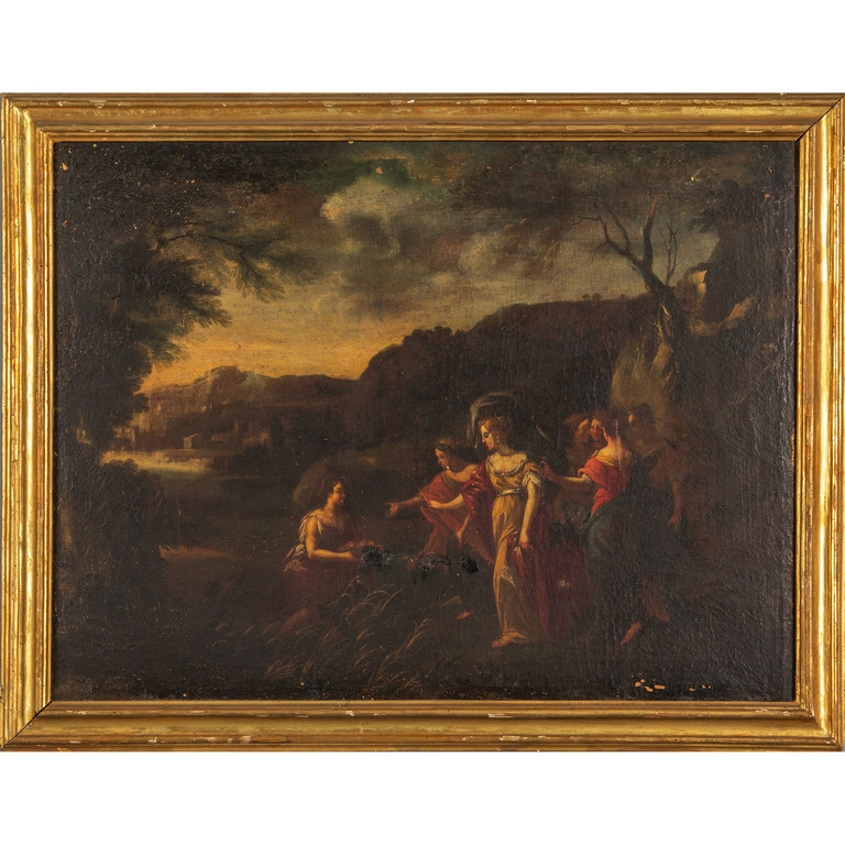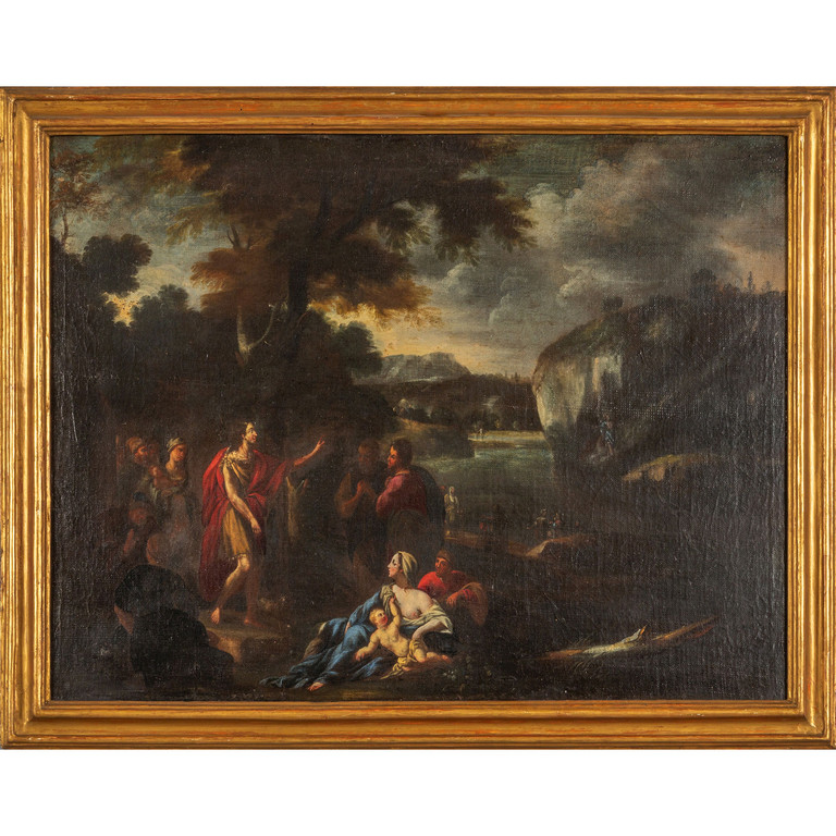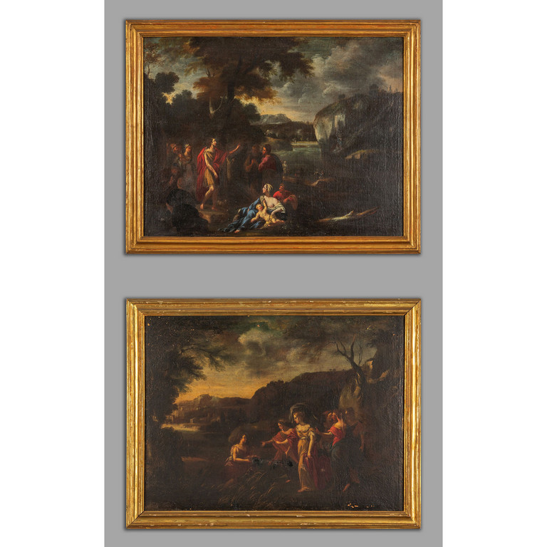 Scuola italiana sec.XVIII 'La predica del Battista' e 'Mosè salvato dalle acque' coppia di olii cornici coeve a sagoma romana