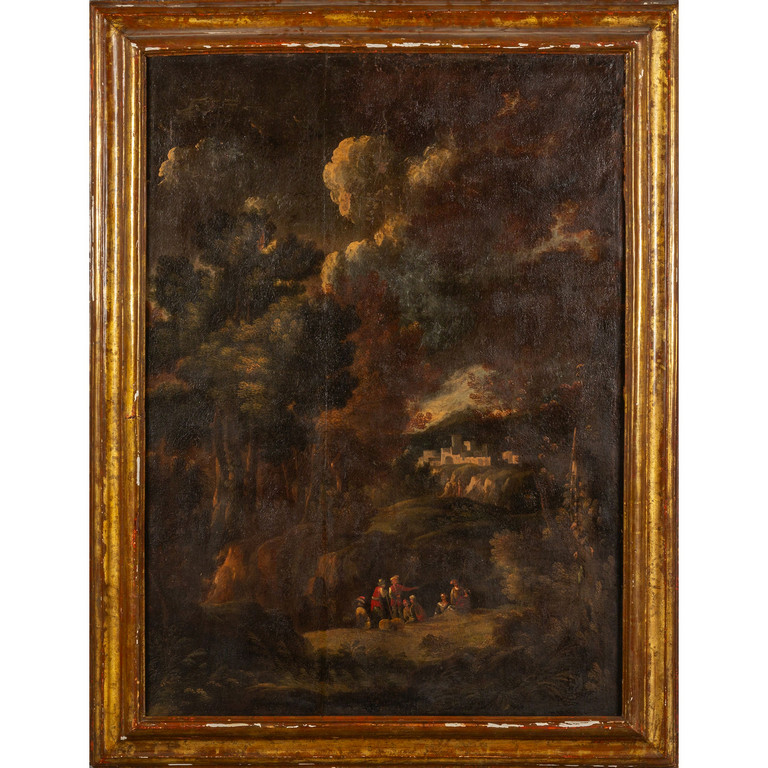 Scuola genovese sec.XVIII 'Paesaggio con figure' olio cornice coeva in legno intagliato e dorato