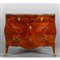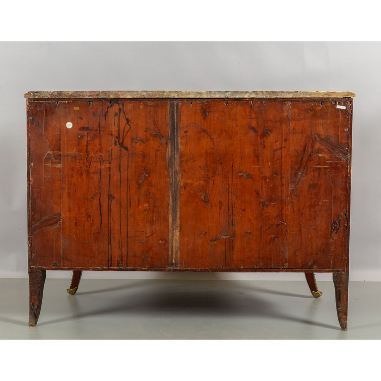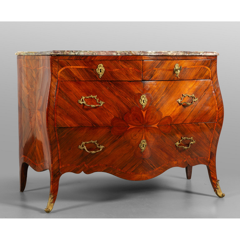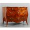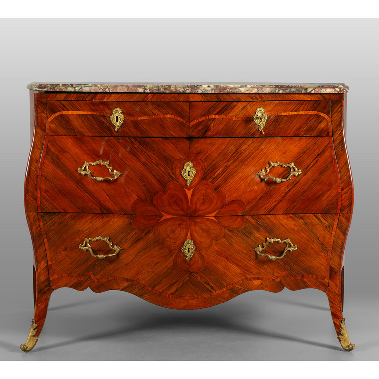 Comò Luigi XV a due cassetti grandi più due piccoli lastronato in palissandro e legno di rosa intarsiato con il tradizionale motivo del cuore piano in marmo fior di pesco Genova metà sec.XVIII